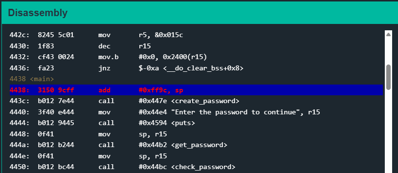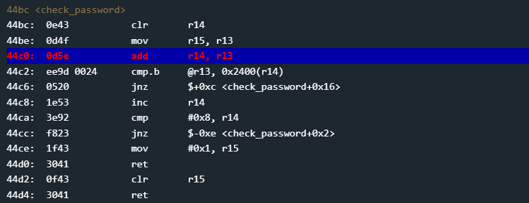 I type “testing” as my input and set a new breakpoint on the check_password function. In this function we can see that the value stored at the address in r13 is compared to the value stored at #0x2400 with an offset of r14 which is 0 at the moment. If we check what is at the memory address in r13 by using the command r r13 we can see that it stored my input that I entered earlier.