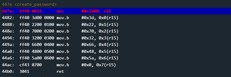 Since I’m fairly certain this is the password, I set a break point at the end of the function so I can read the password out from memory. I used the command r 2400 7 to read out the password.